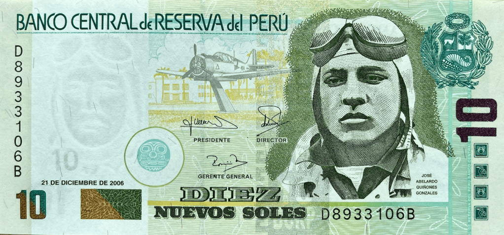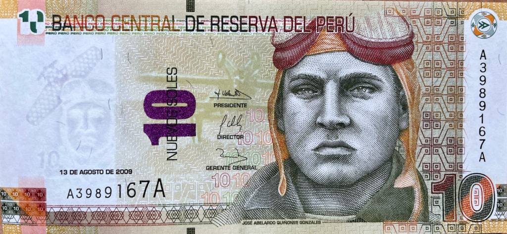 The 10 Nuevos Soles (PEN) notes released between 1991 – 2020 bear José Abelardo Quiñones Gonzáles (1914 – 1941), on the obverse.