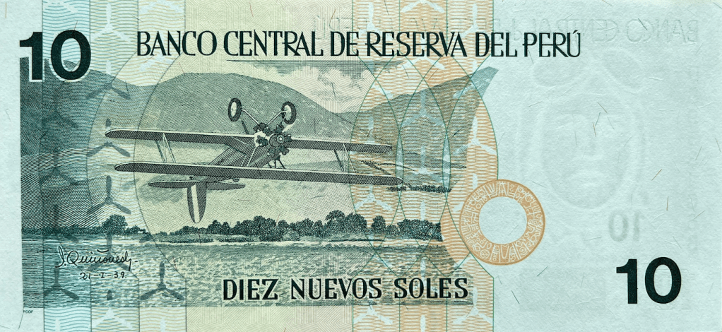 José was a Peruvian military aviator who became a national hero. He joined the Peruvian Air Force in 1935 despite his parents’ opposition and rapidly developed great flying skills that set him apart from his peers. Known for his aerial acrobatics, he performed a memorable maneuver on the day of his graduation from aviation school, flying his plane (a Caproni 113), inverted less than two meters above ground. This scene is depicted on the reverse of the 2006 Series note shown below.