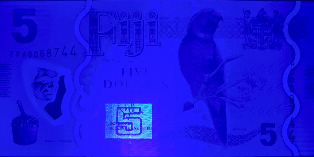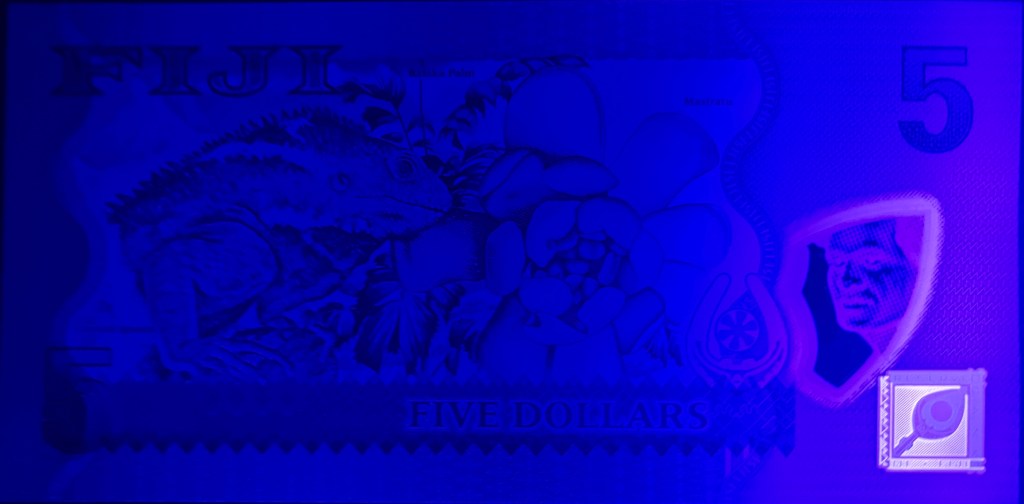 One of the main security features on the note is the clear window depicting the head of a Fijian man, best observed when the note is held to the light. Other features come to life under florescent lights. On the obverse the note’s denomination is seen within the bottom half while the reverse hones in on the Reserve Bank of Fiji emblem featured within the lower right corner.