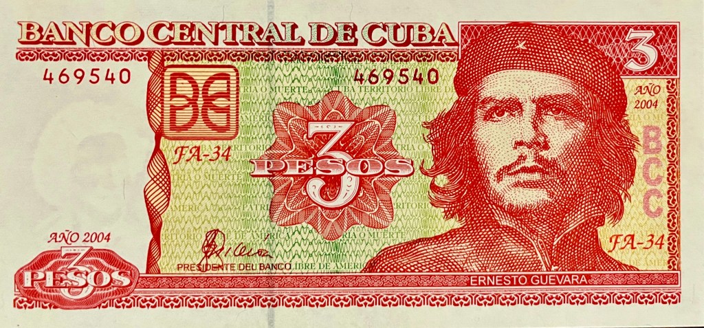 There is no shortage of interesting historical facts associated with Cuban Pesos, originating with former colonial power Spain, to coming under the influence of the United States, followed by none other than the polarized orbit of the Soviet Union. If only these pesos could speak! To understand Cuba’s peso is to delve into centuries of history, political philosophies, imperial tendencies, that ultimately shaped not only Cuba’s national identity but the course of history on a global scale. As a result, one stark factor continuing to impact the Cuban Peso (and Cuba alike), to this day, is the US embargo levied upon the island nation (for political reasons), since 1958. It becomes easier then to appreciate the symbolism and iconography depicted on Cuba’s currency, starting with the 3 Peso note and the tale of revolutionary hero Che Guevara.