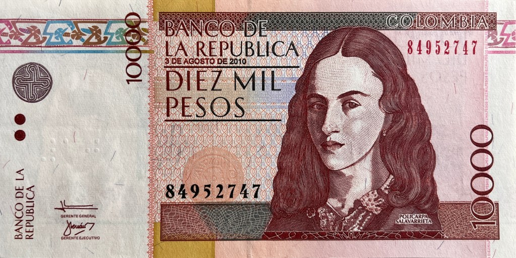 Today, Salavarrieta is recognized as one of the most prominent patriot women in Colombia’s war for independence. Her spirit is immortalized as the subject of countless poems, plays, and other cultural icons throughout Colombia. She also appeared on stamps and currency as is the case with this Colombian 10000 Pesos note. The note is made of paper material. In 2016, the Central Bank of Colombia issued a new series, but Salavarrieta was no longer on the 10000 note.