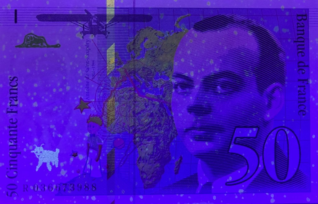 When subjected to UV light, the note produces a sheep in the watermark panel on the obverse. The sheep is another character from The Little Prince novella.